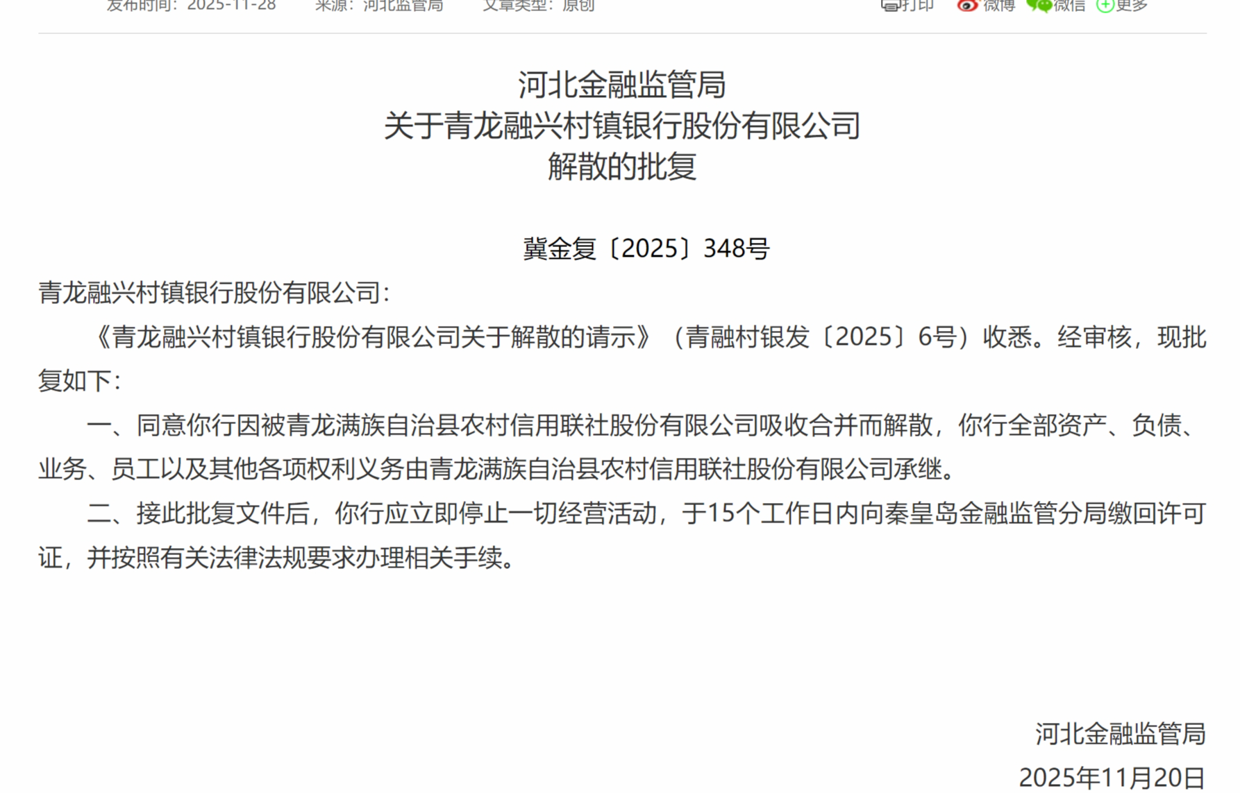 泰安配资 青龙融兴村镇银行获批解散 青龙满族自治县农村信用联社承继其全部业务 泰安配资 来源:领航优配APP下载 网站:翔云优配官方网站登陆入口 日期:2025-12-14 18:46:15 查看:75